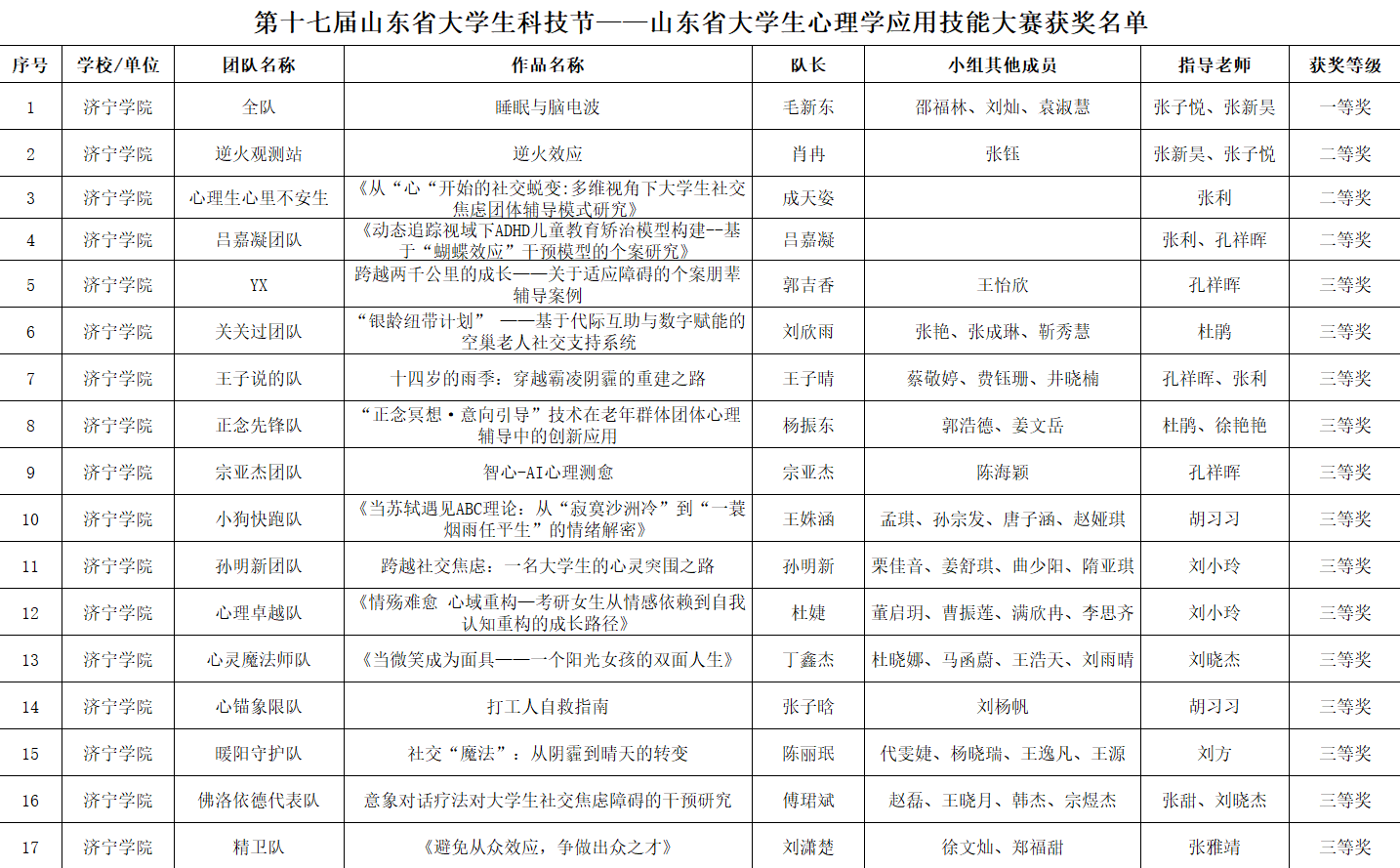 我校高度重视本次竞赛,校内前期由学生工作处、共青团济宁学院委员会主办,教师教育学院团委、“心晴”辅导员工作室、心理协会承办进行预选赛,充分发挥专业教师和学生优势,通过制定方案、组建团队、打磨作品、专业教师精心辅导等多环节筹备。大赛共收到参赛作品2704项,经过角逐我校教师教育学院4支队伍进入省决赛,决赛中2024级心理咨询2班毛新东团队首获心理科普影视创作赛道一等奖,2024级心理咨询1班肖冉团队获心理科普影视创作赛道二等奖,2024级心理咨询2班成天姿和2022级学前教育师范班吕嘉凝分别获应用心理案例开发赛道二等奖,其余13支队伍获省级三等奖。