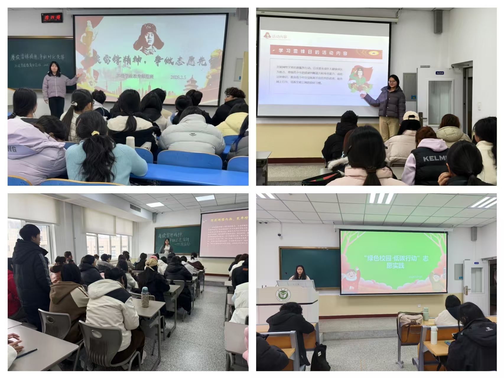 “传承精神,绿色同行”。3月16日至18日,各班级组织开展“身边的雷锋”故事宣讲、“绿色校园低碳行动”主题宣讲及雷锋主题团日活动,传递奉献精神,倡导绿色生活。同学们在交流中分享志愿感悟,推动雷锋精神与低碳理念深入人心。