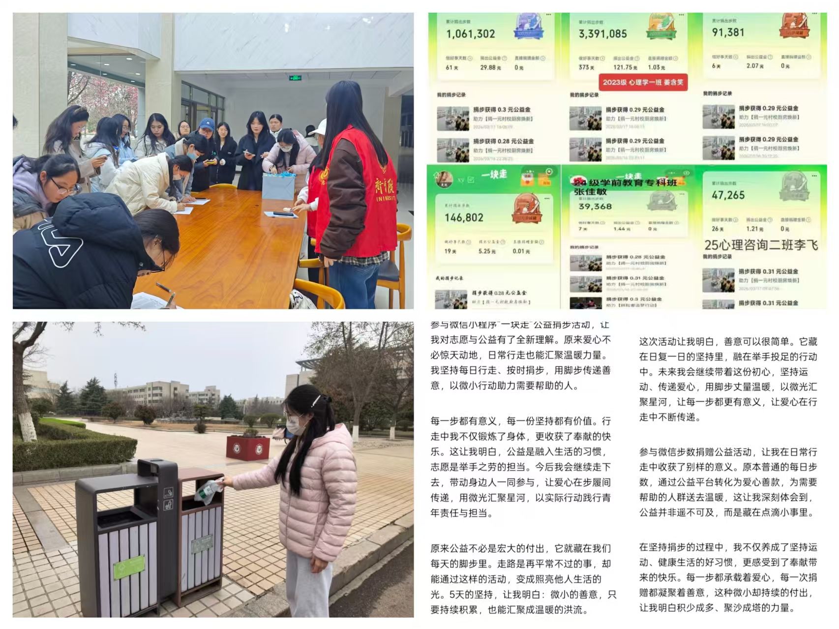 “微光汇聚,志愿同行”。3月15日至18日,学院依托“一块走”小程序发起公益捐步打卡活动,将行走步数转化为公益捐款,同学们踊跃参与并分享活动感悟,以实际行动践行雷锋精神。同期开展的“盲盒拆启”特色志愿活动,将学业互助、绿色低碳、校园焕新等内容融入其中,以趣味形式传承雷锋精神,让志愿服务浸润校园生活。